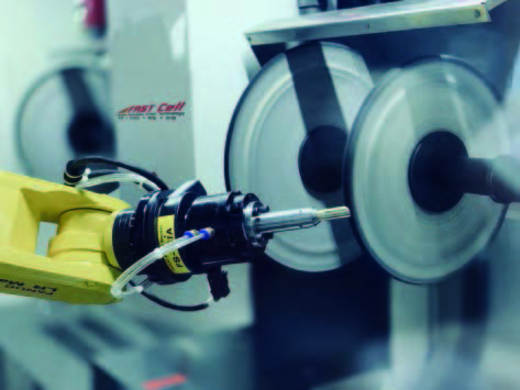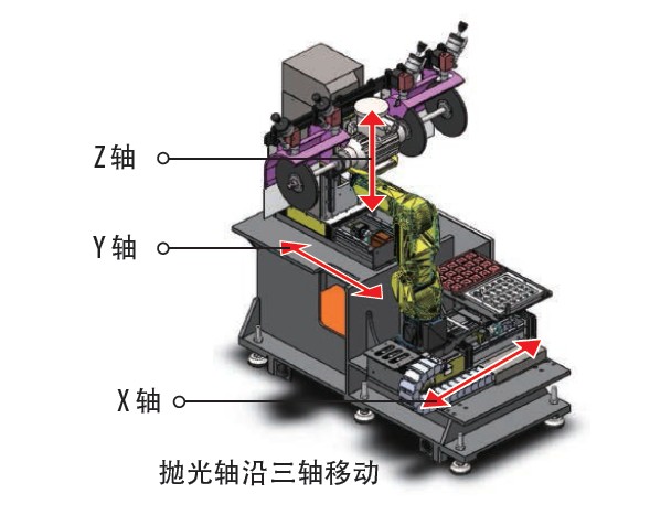 机器人安装在导轨上,可以向左右方向(X 轴)移动。抛光主轴可以沿上下方向(Z 轴)及前后方向(Y 轴)移动。