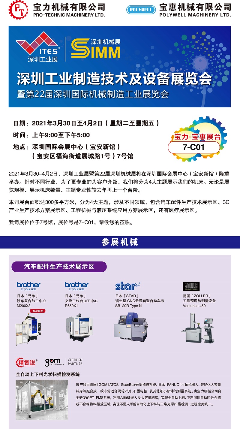 ITES&SIMM深圳国际工业制造技术展览会暨第22届深圳国际机械制造工业展览会(2021/3/30-4/2)活动细节日期: 30/03 – 02/04/2021地点: 深圳国际会展中心(深圳宝安区新馆)分类: 展览会